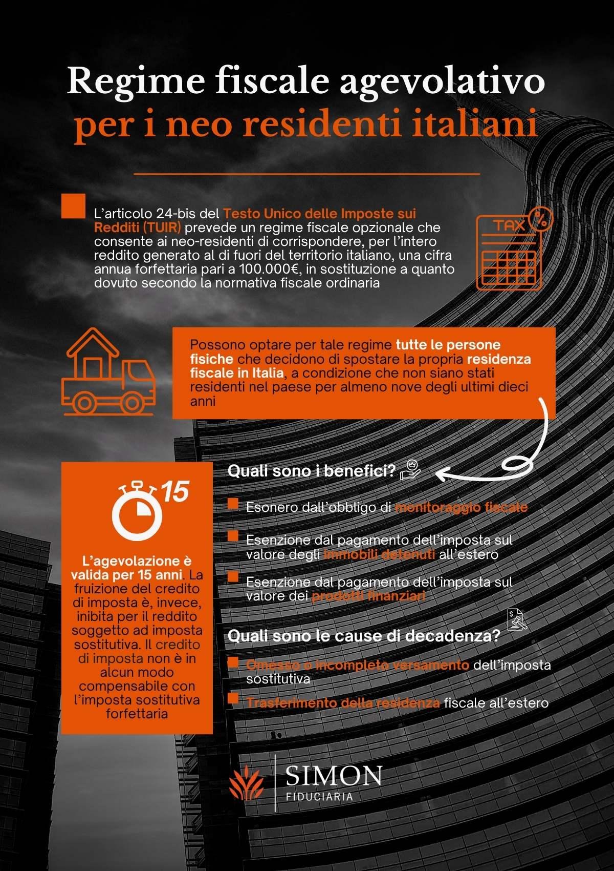 L’articolo 24-bis del Testo Unico delle Imposte sui Redditi (TUIR) prevede un regime fiscale opzionale che consente ai neo-residenti di corrispondere, per l’intero reddito generato al di fuori del territorio italiano, una cifra annua forfettaria pari a 100.000€, in sostituzione a quanto dovuto secondo la normativa fiscale ordinaria.
