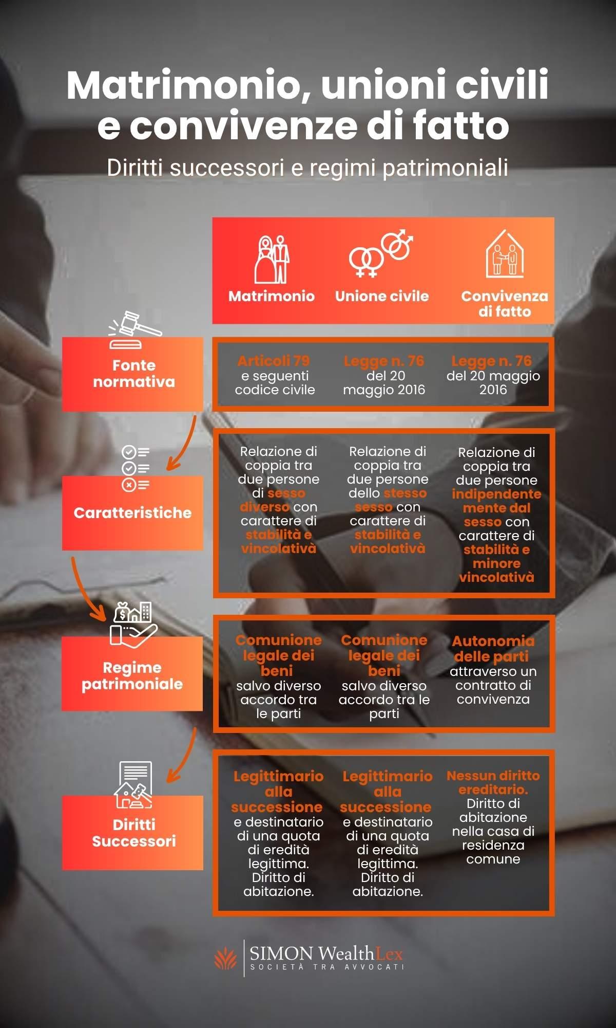 Matrimonio, unioni civili e convivenze di fatto: diritti successori e regimi patrimoniali